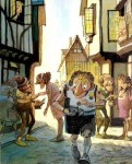 Szeme-szája elállt a csodálkozástól az óriási bútorok láttán. A hokedli a feje búbjáig ért. Lábujjhegyre kellett állnia, hogy rálásson a munkapadra. A kalapács nyele olyan hosszú volt, mint az ő karja. Pancsinelló nyelt egy nagyot, és elindult kifelé.