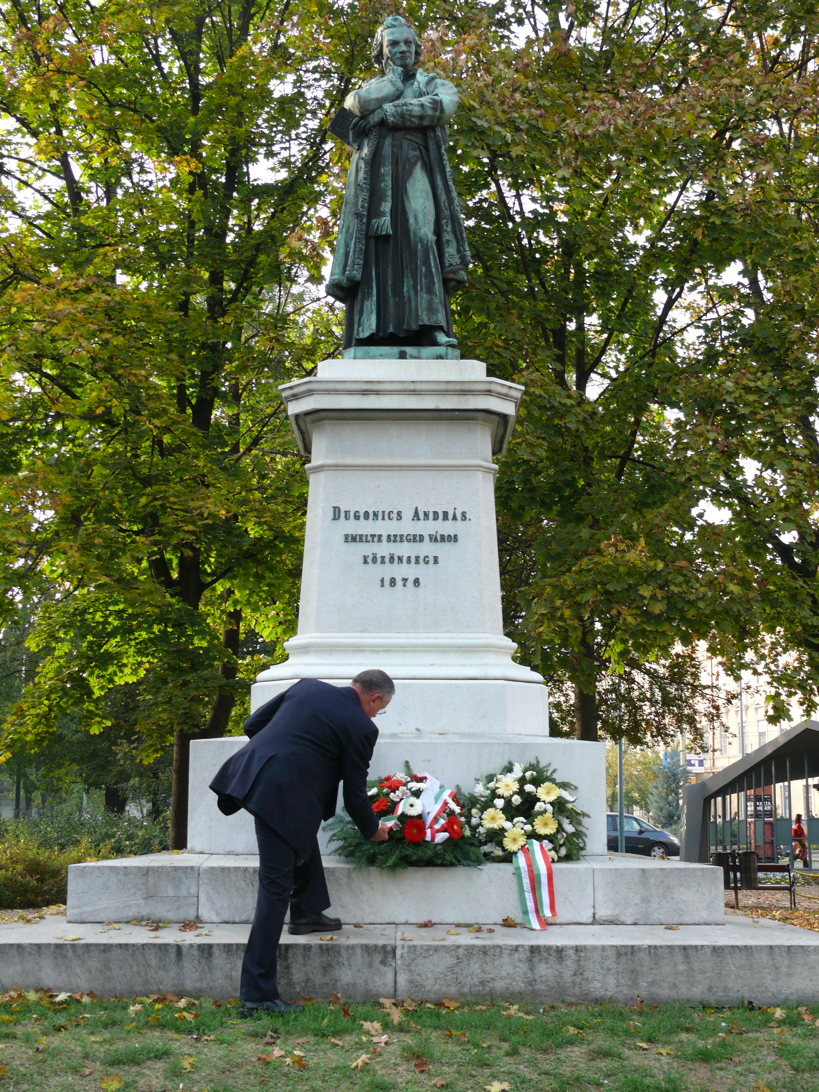 | SzePi képek > A 2008/09-as tanév eseményei képekben > Koszorúzás Dugonics szobránál (2008.10.16) |